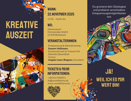 Unter Anleitung wirst du in die Kunst der Gravur eingewiesen und gravierst dein eigenes Glücksglas. Darüber hinaus wirst du Impulse zum Stressabbau erleben und